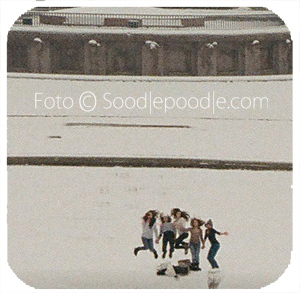 Diesmal  gar mit – einen Tusch, please! – Mitfotografierten , die nochdollererweise dasselbe Motiv auf ihren Handies/Kameras haben müssten. Denn diese fünf jungen Damen schafften es, trotz Winterkälte sehr agil ein luftiges Bild per Selbstauslöser anzufertigen. Und hier sind sie, in der Luft schwebend: