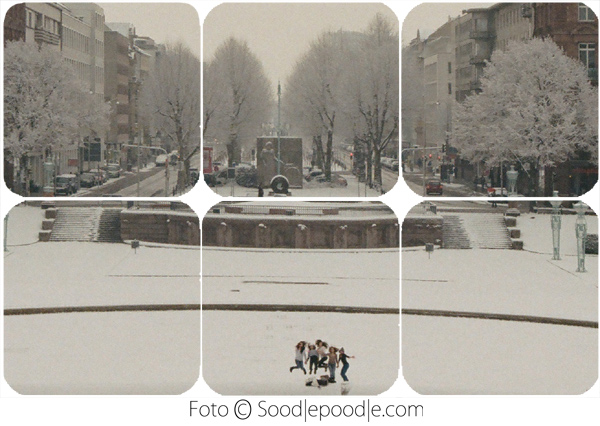 Von solcher Pulvrigkeit war er (dieser Schnee, dieser Morgen), daß er gar kleineste Vorsprünge unterstrich, wie man hier sehr schön an den “nachgemalten” Linien des Carl-Benz-Reliefs hinter dem kleinen schwarzen Kringel sehen kann. Und die Bäume sehen so frisch verzuckert natürlich auch am besten aus. Zusammen mit dem Sandstein, der den Friedrichsplatz gestalterisch und farblich bestimmt, doch ne freundliche Atmosphäre, oder?!