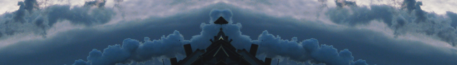 Für meine klickbaren Menues habe ich mir die Regel gesetzt, immer einen Ausschnitt des Startbildes zu wählen. Beim Reinzoomen ins Originalgespiegelte fällt mir dieses zusammen-fallende Dach mit “Zentral(regen)schirm” in der Mitte unten auf, auf das die Wolken zu fliegen oder das Wolken umkränzen, kann man schlecht sagen. Könnte trotz erkennbarer Schornsteine ebensogut der SteamPunkBug eines das weite W-Meer durchpflügenden Schiffes sein: