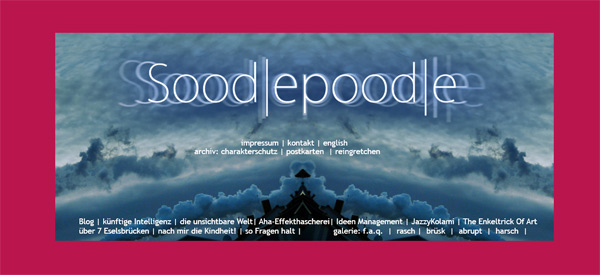 Ein denkwürdiges Foto im Spiegel und ordentlich Farbdramaturgie und wir kommen an in der modernen KinoÄsthetik Abteilung Fantasy-Abenteuer-CGI Welt. Ich stelle mir noch einen völlig anderen Schriftzug anstelle des Soodlepoodles vor, vielleicht additional einige winzige grellbunte Figuren, die am unteren Bildrand herumschwirren et voilá: eine andere Welt, ein neues, faszinierendes Abenteuer!